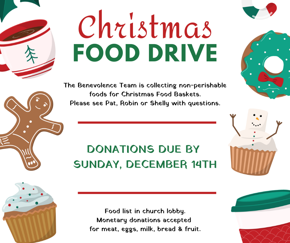 We are collecting non-perishable food for Christmas Food Baskets until December 14th. And, monetary donations for items such as meat, milk, bread, eggs, and fresh fruit. Please stop by the table in the church lobby for the list of non-perishable items needed. Thank you!
