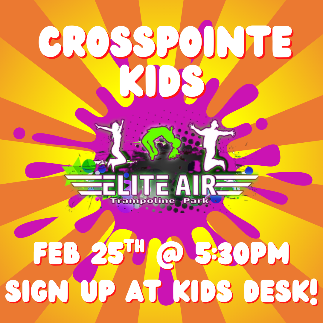 Crosspointe Kids will take a trip to Elite Air. Signup at the Kids Desk. We will leave church on the 25th at 5:30 pm.