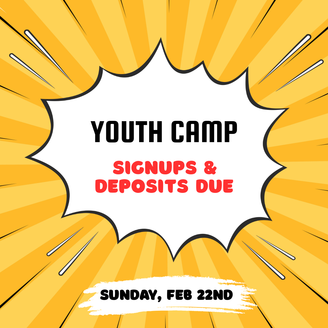 Signup deadline for Youth Camp is Sunday, February 22nd. Deposits are also due at that time.